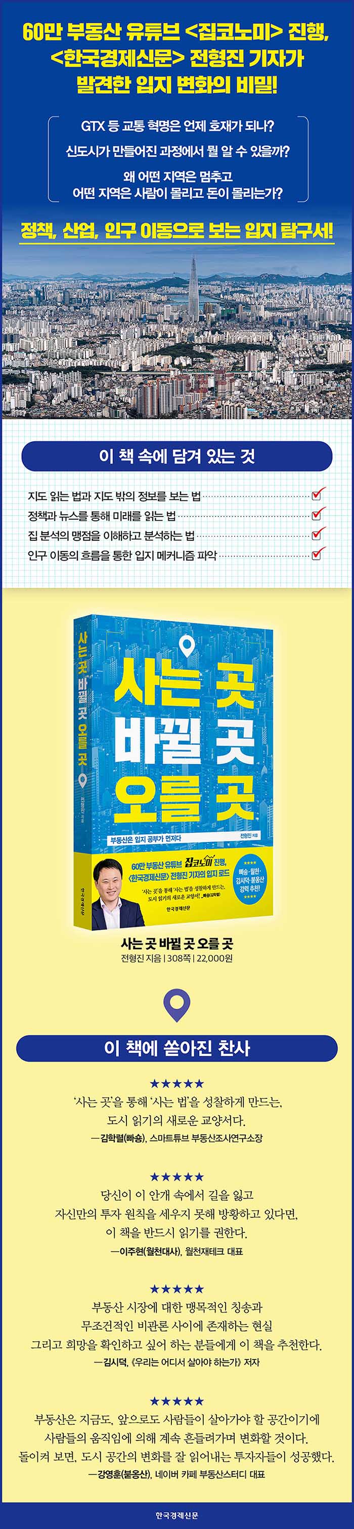 이 책에서는 ‘어디가 오를까’, ‘어느 아파트를 사야 할까’ 대신 공간이 만들어지는 과정에 집중했다. 즉 ‘어디’가 아니라 ‘어떻게’ 만들어지는지, ‘왜’ 그곳에 사람이 몰리고 돈이 몰리는지 주목한다. 그리하여 이 책은 부동산 투자자 김학렬(빠숑) 대표도 밝혔듯, “‘사는 곳’을 통해 ‘사는 법’을 성찰하게 만드는, 도시 읽기의 새로운 교양서”다.